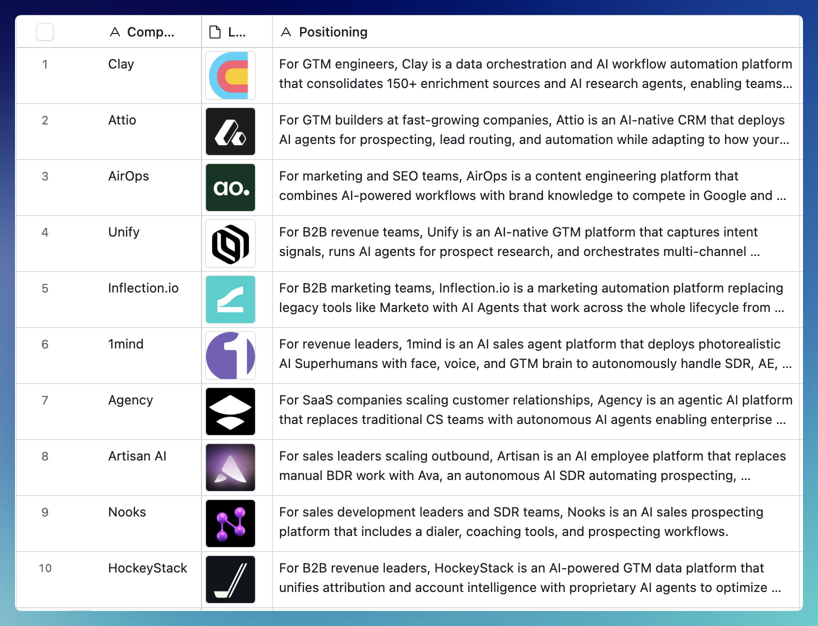 Tracking the most promising AI GTM Tech products and companies. Get the Airtable with AI product information, positioning, customer logos, funding/valuations, and hype scores. Updates and expands regularly.